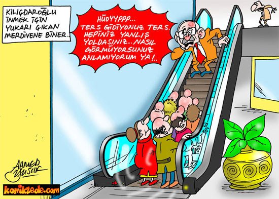 CHP Genel Başkanı Kılıçdaroğlu, Beşiktaş'ta düzenlediği basın toplantısının ardından yürüyen merdivende zor anlar yaşadı. Yanlış merdivene binen Kılıçdaroğu, yukarı hareket eden merdivenden güç de olsa aşağıya indi..