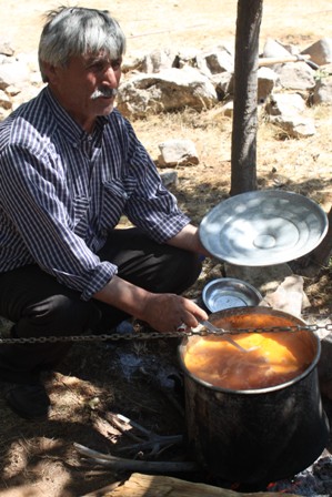 Akşam çadırımı kurmuş, ateş yakmak için kuru dalları toplarken İbrahim geldi. Birkaç keçi dağın öte yüzüne gitmişler günlerdir de orada yayılıyorlarmış, onları tutmaya gitmiş. Kışlakta tahta ve kalaslarla büyükçe bir çadır yapmış orda kalıyorlar, kara çadırı da mutfak olarak kullanıyorlar. Çadırın önüne kurdukları güneş paneli hem çadırı aydınlatıyor, hem televizyonu çalıştırıyor. Çayımız demlenirken sofrayı kuruyor Songül cadım. İbrahim, kusura bakma, telaşeli günlerimiz, pek bir şey hazırlayamamışlar, dese de taze yoğurt cana değiyor.