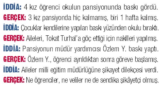 İl Milli Eğitim Müdürü Necati Akkurt'un dün yaptığı yazılı açıklama da çarpıtma olayının vahametini gözler önüne serdi. Öğrenciler H.D., G.D., Ş.Ç. ve Ş.D.'ye, din kültürü dersi öğretmeni Ahmet A. ile kaldıkları pansiyonun müdür vekili Özlem Y. tarafından baskı yapıldığı iddiası üzerine inceleme başlattıklarını anlatan Akkurt, elde ettikleri sonucu şöyle özetledi: "4 öğrenciden H.D., G.D. ve Ş.Ç., okulun pansiyonunda hiç kalmadı. Bu öğrencilerin aileleri Tokat'ın Turhal ilçesinde iş bulduğu için çocuklarının naklini o bölgeye yakın olan Aydınca Lisesi'ne aldılar. Diğer öğrenci Ş.D., 20-27 Eylül tarihleri arasında okulumuz pansiyonunda bir hafta kaldı. Haberde ismi zikredilen okulumuzun pansiyonundan sorumlu müdür yardımcısı Özlem Y. ise 1 Ekim'de göreve başlamıştır. Bu nedenle kız öğrencilere herhangi bir dinî baskı yapmış olması mümkün değildir. Zorlama veya baskı iddiasıyla ilgili olarak bize herhangi bir şikâyet gelmedi. Öğrenciler, veliler veya sendika temsilcisi dilekçe vermedi."