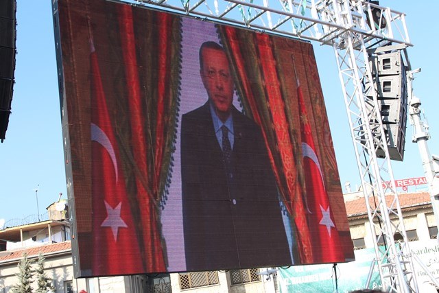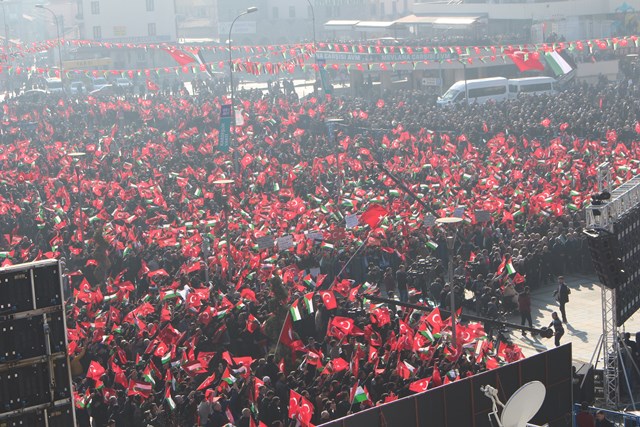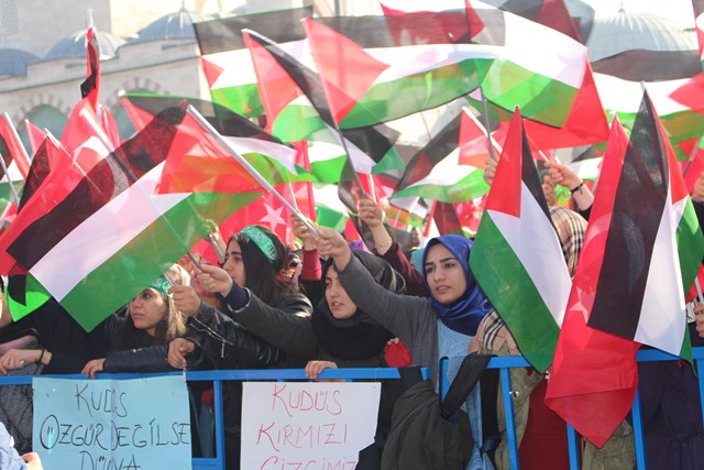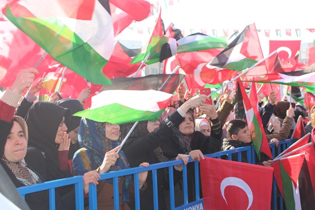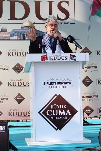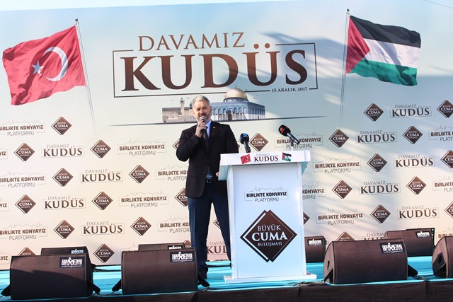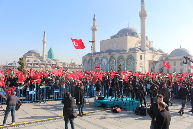 Cumhurbaşkanı Recep Tayyip Erdoğan, Konya Mevlana Meydanı'nda düzenlenen "Davamız Kudüs Konya Buluşması"na, İstanbul'dan canlı yayınla bağlandı. Cumhurbaşkanı Erdoğan, Amerika'nın Kudüs'le ilgili kararının iptali için Birleşmiş Milletler (BM) nezdinde de girişimler başlatacaklarını bildirdi. Mevlana Meydanı'ndaki vatandaşlar aracılığıyla dünyanın dört bir tarafındaki "Kudüs aşıklarına" selam gönderen Erdoğan, sözlerini şöyle sürdürdü: "Filistin'in her biri direniş abidesi cesur gençlerini selamlıyorum. On yıllardır vatan hasretiyle gözyaşı döken Filistinli mültecileri selamlıyorum. Gazze'nin, Ramallah'ın, Kudüs'ün kahraman kadınlarına, sizlerin vasıtasıyla en kalbi selamlarımı yolluyorum. Onların da bugün gözlerini ve gönüllerini size çevirdiğini çok iyi biliyorum. Çünkü siz, bugün şu muhteşem meydanda, sadece Kudüs'e sahip çıktığınızı göstermiyorsunuz; sizler aynı zamanda senelerdir İsrail terörüne direnen tüm Filistinli mazlumlara da umut veriyorsunuz. Siz, bu mübarek cuma günü Kudüs'ün kardeşi Konya'dan bir kez daha Filistin'in ve Filistinlilerin yalnız olmadığını haykırıyorsunuz. Rabbim sizlerden razı olsun."