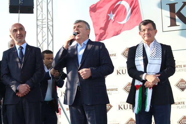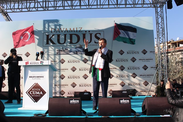 62, 63 ve 64 Hükümet Başbakanı ve Konya Milletvekili Ahmet Davutoğlu, yaptığı konuşmada İsrail ve ABD’ye adeta ateş püskürdü. Kudüs meselesinin Türkiye’nin asıl meselerinden birisi olduğunu söyleyen Davutoğlu, “Kudüs’ özgür olana kadar, Konya’ya ve Türkiye’ye uykularımız haramdır, susmak zulümdür. Milletler uğruna can verdikleri değerlerle yaşarlar. 2017 yılı Kudüs’e vuslatımızın 500’üncü yılıdır. Tam bundan 500 yıl önce Yavuz Sultan Selim Han ile Kudüs bize emanet edilmiştir. Kudüs bundan 100 yıl önce işgal edilse biz işgal tanımayız. Kudüs tam olarak bizim olana kadar mücadelemiz sürecek. Kudüs’ün Kardeş şehri Konya elbette birbirine kavuşacaktır. Türkiye’deki darbe planları yaparken hep Kudüs’e atıfta bulunmak istediler. 1980 darbesinden hemen önce Rahmetli Necmettin Erbakan liderliğinde Konya’da bir Kudüs mitingi gerçekleşmişti. Bu yürüyüş 12 Eylül darbesine gerekçe olarak gösterildi. 28 Şubat’ta Ankara’da yapılan Kudüs gecesi yapıldığı için 28 Şubat Post modern darbe gerçekleşti. Darbeciler bizim Kudüs’le ilgilenmemizi istemiyor. Daha sonra biz iktidar olduktan sonra Filistin’e büyükelçilik açtık. Kudüs’te tek büyükelçiliği olan ülke Türkiye’dir. Daha sonra bizler Filistin’e destek vermeye devam ettik. bizim önümüze bir çok engel çıkardılar. Trump’un aldığı Kudüs kararı gayri meşrudur. Buna bizler asla izin vermeyeceğiz” dedi.