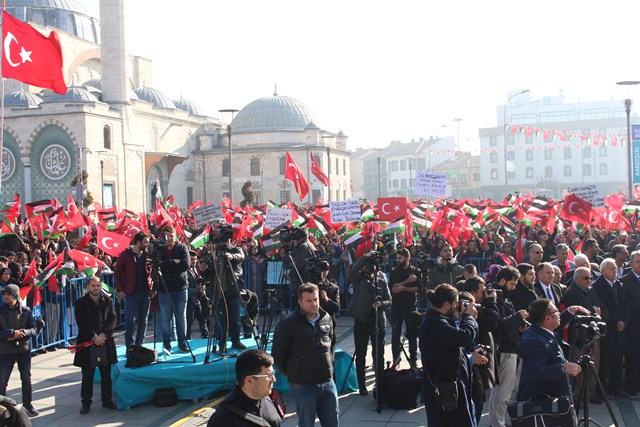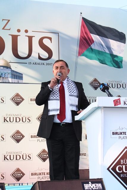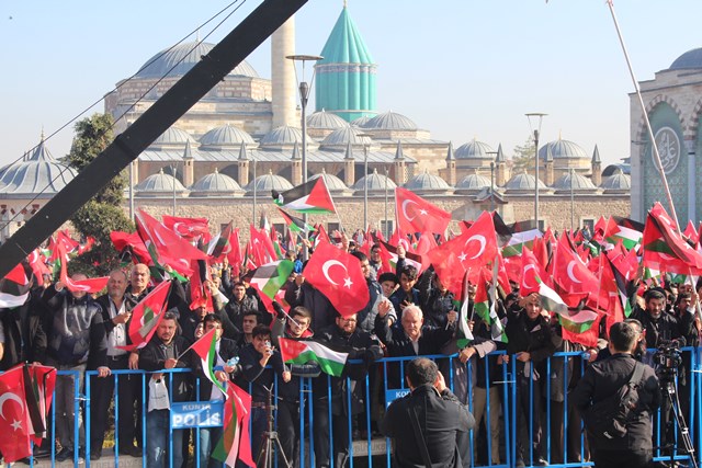 Büyükşehir Belediye Başkanı Tahir Akyürek, “Bugün çok güzel bir amaç için buradayız. Terör devleti İsrail’in Kudüs’ü gasp etme çabasına karşı Konya meydanından buna hayır diyoruz. Konya her zaman bu duruşu sergiledi. 100 yıl önce elimizden alınan Kardeş şehrimizi Kudüs, bugün halen işgal altındadır. İnşallah Türkiye’nin ve Cumhurbaşkanımız Erdoğan’ın öncülüğünde yeniden kurtulacaktır. Bu bayraklar bu dostluklar bunun işaretidir. Kudüs’ün hür olması demek İslam ümmetinin yeniden buluşması demektir. Kudüs düşerse, Mekke, Medine, İstanbul, Konya düşer” dedi.