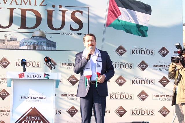 Türkiye – Filistin Parlamentolar Arası Dostluk Grubu Başkanı Hasan Turan, “Konya deyince Kudüs aklıma geliyor. Ne zaman Kudüs davası olsa ilk kıyama kalkan her zaman Konya olmuştur. Aynı zamanda bunun bedelini Konya her zaman ödemiş ve ödemekten de çekinmemiştir. Konya’da bu mitingin yapılacağını duyduğumda ‘Konya’ya yakışan da bu’ dedim. Bir ay önce Kudüs’e gittiğimizde Mescid-i Aksa’nın çevresinde Konyalıları gördüm. Konya hiçbir zaman Kudüs’ü yalnız bırakmıyor. Kudüs, İsra’dir, yürüyüşe geçmenin miracı Kudüs’tür, direnişe geçmenin miracı Kudüs’tür, efendimizin ayak izlerini taşıyan bir yerdir. Kudüs sadece toprak parçası değil bizim ilk kıblemizdir. Bizim savaşımız inanç meselesidir. Bu mücadele hak ile haksızlığın mücadelesidir. “ dedi.
