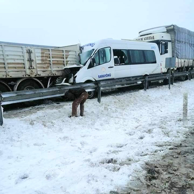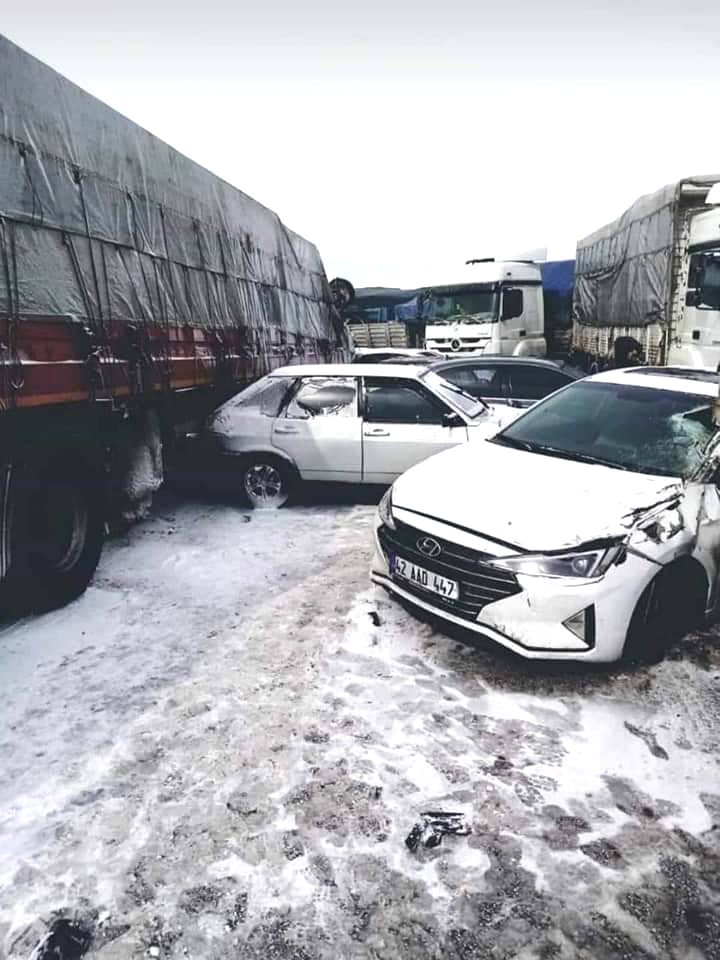 Konya-Afyonkarahisar kara yolunun 20 kilometresinde etkili olan tipi ve buzlanma nedeniyle görüş mesafesi oldukça düşen yolda, aynı yönde seyreden 17 araç kontrolden çıkarak çarpıştı.