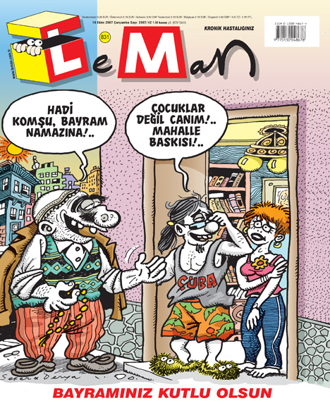 Leman Dergisi dindarlarla dalga geçmeye devam ediyor. Cumhurbaşkanı Abdullah Gül'ün eşi Hayrünnisa hanımı playboy kızı şeklinde kapağına taşıyan Leman şimdi de gündemden düşmesine rağmen 'mahalle baskısı'nı kapak yaptı ve "Bayaramınız Kutlu olsun" demeyi ihmal etmedi.