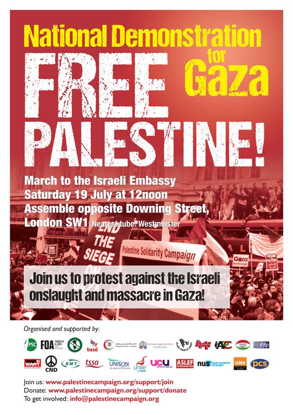 Yürüyüşün, (19 Temmuz 2014) Cumartesi günü saat 12.00'de Başbakanlık önünden başlayarak South Kensington'daki İsrail Büyükelçiliğine doğru gerçekleştirilmesi planlanıyor...