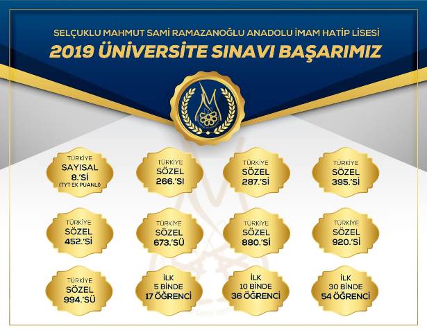Yükseköğretim Kurumları Sınavı (YKS) sonuçlarının açıklanmasının ardından Mahmut Sami Ramazanoğlu Anadolu İmam Hatip Lisesi, ilk 1000’e 9 öğrenci yerleştirerek süregelen başarısını 2019 yılında da devam ettirdi.