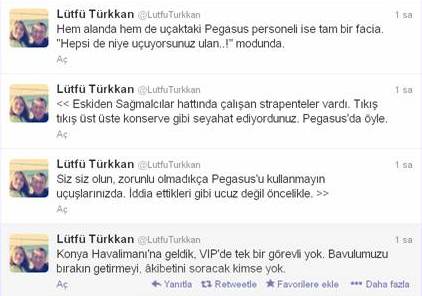 Sabah uçağı ile Konya'ya gelen Türkkan'ın yine twitterından paylaştığı mesajlar, Konya uçağının uçuş hizmetlerinden ve Konya havaalanı hizmetlerinden memnun kalmadığını ortaya koydu. Türkkan ilk mesajında "Konya Havalimanı'na geldik, VIP'de tek bir görevli yok. Bavulumuzu bırakın getirmeyi, âkibetini soracak kimse yok" diye yazdı.