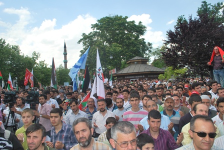 Konya Sivil Toplum Örgütleri Platformu İsrail’in Gazze’ye giden yardım gemilerine yaptığı saldırıyı Kayalı Park’ta çok sayıda vatandaşın katıldığı mitingle protesto etti. Mitingde İskenderun’da şehit düşen askerler de unutulmadı. Mitingin en duygu yüklü yanı ise Gazze’ye giden gemide bulunan Konyalı bir vatandaşın kızı olan 11 yaşındaki Senanur Nortçu’nun yaptığı konuşma oldu. Konuşmasında babasını Allah’a emanet ettiğini söyleyen Senanur eğer babası şehit ise bundan çok büyük gurur duyacağını söyledi. Miting sırasında İsrail aleyhine sloganlar atan vatandaşlar, İsrail bayrakları yaktı. Miting sırasında Gazze’den alınan bilgilerin vatandaşlarla paylaşıldığı anlarda ise İsrail aleyhinde sloganlar yükseldi.