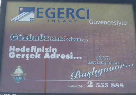 Açıkhava reklam mecrasına yeni bir firma gelmiş. İsmi Eğerci İnşaat. Bu reklamı keşke yapmasaydı. Bu reklamı yapan kimse reklamdan zerre anlamıyor baştan onu söylemek lazım. Sadece reklamdan değil grafikten de anlamıyor. Reklamda kullanılan başlıklara bakın hele:
