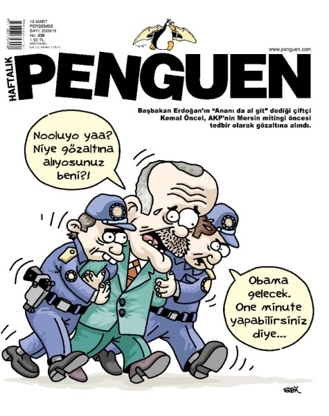 Karikatür dergisi Penguen'in yeni sayısının kapağında yine Başbakan Erdoğan var. Emniyet kuvvetleri Erdoğan'ı gözaltına alırken, bakın neyi sebep olarak gösteriyor...