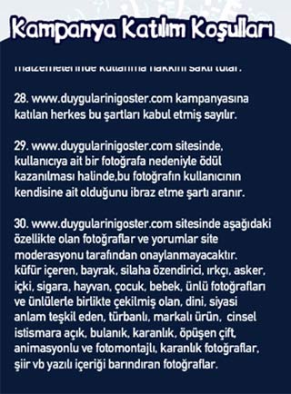 da bilineceği üzere, uluslararası bir şirket olarak herhangi bir görüşe taraf olmamız söz konusu olamaz. Ne var ki 'Duygularını Göster' kampanyası dahilinde gerçekleştirdiğimiz fotoğraf yarışmasının katılım şartları arasında denetimimizden geçmemiş maddeler olduğu farkedilmiştir. Herkesin eşit şartlarda katılımının devam etmesini ana ilke olarak benimsiyoruz ve yarışmaya katılım şartlarının da bu doğrultuda düzeltilmesi sağlanmıştır. Yarışmamız devam etmektedir, geçmişte düzenlediğimiz tüm kampanyalarda olduğu gibi ilgilenen herkesin katılımına açıktır.'