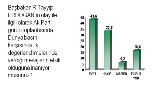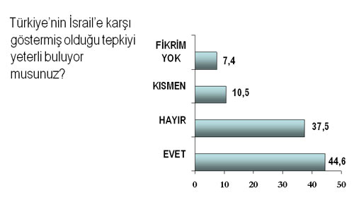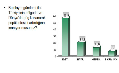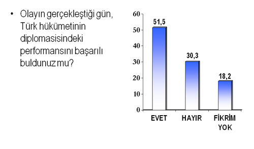 Araştırmaya göre Türk halkı, İsrail’e gösterilen tepkinin yeterli olmadığı düşüncesinde değil ama, Başbakan Erdoğan ve Dışişleri Bakanı Ahmet Davutoğlu'nun yurtdışı seyahatlerinde olmalarına rağmen, hızlı bir diplomasi süreci izleyerek, olayın aydınlanması ve İsrail’e yönelik uluslararası düzeyde bir takım yaptırımların uygulanması adına başarılı bir süreç yönetildiğini de düşünüyorlar.