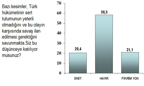 Türkiye gündemi ve dünya kamuoyu İsrail’in yardım gemilerine saldırarak, sivilleri öldürüp yüzlerce gönüllüye esir almasına odaklanmış ve bazı kesimler ifadeleri ile Türkiye’nin savaş açabileceği yönünde iddialarda bulunmuştu. Türkiye’de de bazı kanaat önderlerinin de “savaş” sözcüğünü dillendirmesi ile toplumda acaba “Savaş olmalı mı?” veya “Olabilir mi?” gibi soru işaretleri dolaşırken, ANDY-AR halka iki ülke arasında savaş çıkmasını destekleyip desteklemediğini sordu. Ankete katılanların yüzde 58,5'i savaşa karşı olduklarını açıkladı.
