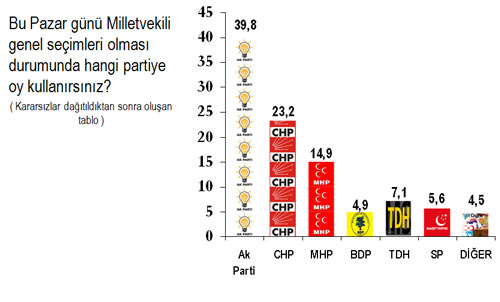 İsrail olayı ile birlikte, Kemal Kılıçdaroğlu’nun genel başkan seçilmesiyle odak noktası haline gelen CHP gündemden uzaklaşılmış olması iktidar partisi AK Parti’ye ne puan kaybettirmiş ne de kazandırdığı ortaya çıktı. “Bu Pazar günü seçim olması durumunda” iktidardaki AK Parti yine birinci parti konumunu yüzde 39,8 ile sürdürüyor. İktidar partisini takip eden Kemal Kılıçdaroğlu liderliğindeki CHP ise yüzde 23,2’lik oy oranına sahip olduğu görülürken, diğer muhalefet partisi MHP’nin oy oranı ise 14,9. Partileşme kararını vererek CHP’ye katılacağı yönündeki iddiaları yalanlayan Mustafa Sarıgül’ün liderliğindeki TDH yüzde 7,1’lik oranı ile dördüncülüğünü sürdürdü. Numan Kurtulmuş liderliğindeki Saadet Partisi’nin oyu ise yüzde 5,6 oranında.