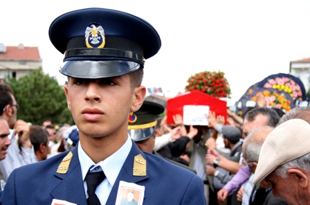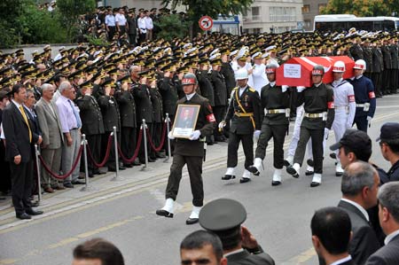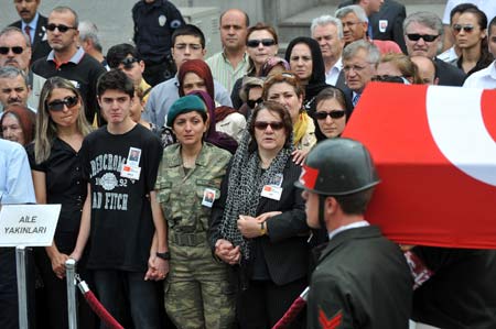 Askeri yetkililer, cenaze töreninin ardından şehidin eşine, tabutun üzerine örtülen Türk bayrağını teslim etti.