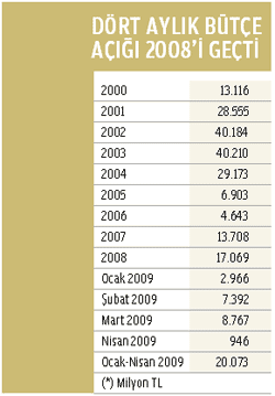 Hükümetin kriz ayarı verdiği Katılım Öncesi Ekonomik Program'a göre bütçe açığı tahmini daha önceki hedeften dört kat saparak 48 milyar liraya çıkacak. 202 milyar lira olarak hedeflenen yıl sonu vergi tahsilat hedefi ise 170 milyar lira. Maliye Bakanlığı'nın verilerine göre Merkezi Yönetim Bütçesi bu yılın dört ayında 20 milyar 73 milyon lira açık verdi.