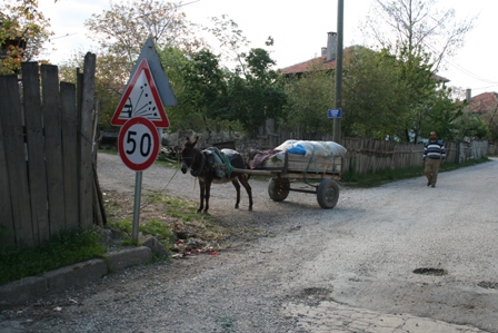 İşte Kurucuova’da arabaya sürülmüş bir eşek… Kurucuova’nın yolları araç trafiğine hiç de elverişli değil. Kurucuovalılar ‘Çağ atladık’ diyenleri ilçeye davet ediyorlar. Ben gittim, gördüm; bu yollarda ancak eşekler ve katırlar rahat hareket edebilir.