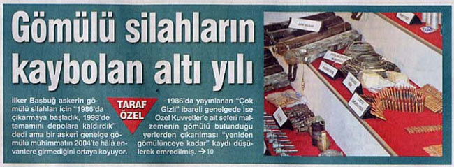 Genelkurmay Başkanı Orgeneral İlker Başbuğ’un 29 nisanda düzenlediği basın toplantısında “Gömülü silahımız yok. 1986’da alınan bir karar çerçevesinde gömülü silah ve mühimmatın depolara alınmasına karar verildi ve bu işlem 1998 yılında tamamlandı ve bu mühimmatlar depolara yerleştirildi” sözleri, Genelkurmay Başkanlığı’nın 2004’te yayınladığı bir dizi genelge ile çelişiyor. Taraf’ın ele geçirdiği belge, 1998’de depolanma işlemlerinin tamamlandığı açıklanan Özel Kuvvetler’e ait gömülü silah ve mühimmatın 2004’e kadar geçen altı yıllık süre içinde envantere kaydının yapılmadığını ortaya çıkardı. Askeri yazışmalarda seferi malzeme olarak da tanımlanan “gömülü mühimmatın” yayınlanan genelge doğrultusunda beş ay içinde Ankara’ya gönderilecek hale getirilmesi de emirler arasında.