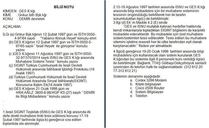 Raporda, şu ilginç bilgilere yer veriliyor: “Türkiye ile İsrail arasında SIGINT bilgilerinin teatisini sağlamak amacıyla; İsrail milli SIGINT ünitesi (ISNU; Israel SIGINT National Unit) ile GES K.lığı arasında 20 Ocak 1998 tarihinde direkt muhabere devresi tesis edilerek işletmeye açılmış olup, hala anılan devre üzerinden bilgi mübadelesine devam edilmektedir.”