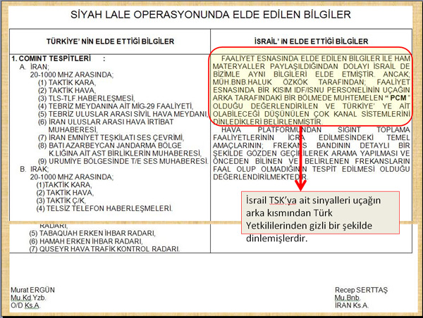 Yine “Siyah Lale Operasyonu”ndan elde edilen bilgilere göre; İsrail'e çalışan birimin Türk Genelkurmayı'na ait telsizleri gizlice dinlediği anlaşılıyor. İsrail'in edindiği bilgiler şu şekilde kaydediliyor: “Faaliyet esnasında elde edilen bilgiler ile ham materyaller paylaşıldığından dolayı, İsrail de bizimle aynı bilgileri elde etmiştir. Ancak Müh. Bnb. H.Ö. tarafından faaliyet esnasında bir kısım IDF/ISNU personelinin, uçağın arka tarafındaki bir bölmede muhtemelen ‘PCM' olduğu değerlendirilen ve Türkiye'ye ait olabileceği düşünülen çok kanal sistemlerini dinledikleri belirlenmiştir.”