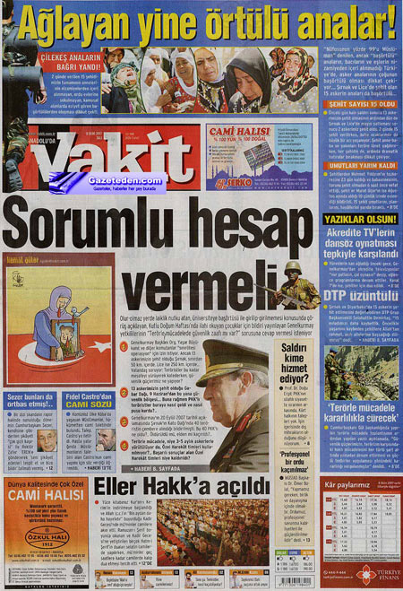 Vakit Gazetesi Org. Yaşar Büyükanıt'ın fotoğrafını birinci sayfaya koyup, üstüne de 13 şehitle ilgili olarak "Sorumlu Hesap Vermeli" yazdı. Vakit'teki haber de şöyle: