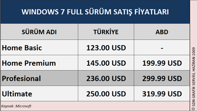 windows 7 Türkiye’de (kutu ürün olarak) Home Basic, Home Premium, Professional ve Ultimate sürümleriyle tüketicilerle buluşacak. Türkiye için açıklanan son kullanıcı liste fiyatları ABD'deki fiyatlardan daha ucuz olarak belirlendi.