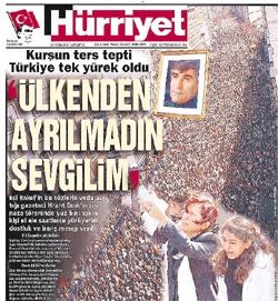 Agos Gazetesi çıkışında uğradığı silahlı saldırı sonucu hayatını kaybeden Hrant Dink'in cenaze töreninde eşi Rakel Dink'in yaptığı dokunaklı konuşmayı, Rakel Dink'in beyaz güvercinleri uçurduğu bir fotoğrafın üzerinde Hürriyet manşet yapmıştı. Bu manşet yılın en iyi 10 manşeti arasında bi