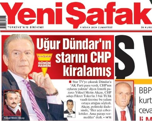 Aslında Yeni Şafak, başlığında haberdeki kişinin CHP'den para aldığı iddiasına gönderme yapıyormuş gibi izlenim yaratıyor. ""Star TV'de Uğur Dündar'ın programına katılarak Kocaeli'nin İzmit İlçesi'nde CHP'nin oylarının yakıldığı yönünde açıklamalar yapan pazarcı Yüksel Metin Akçay, CHP adayı Fikret Toker'in 3 bin TL'lik vaadi üzerine bu yalanı söylediğini itiraf etti."