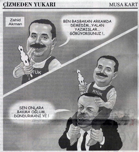 Başbakan Erdoğan'ın karikatüristlerle başı bir türlü beladan kurtulmuyor. Evrensel gazetesinde danışmanı Cüneyd Zapsu'yu sırtına binmiş halde gösteren karikatüre çok kızan Erdoğan bu karikatürden sonra yine burnundan soluyacak. Başbakan, Zapsu'nun 'süvari' olarak gösterildiği karikatür için manevi tazminat davası açmıştı. Bu kez de Musa Kart Zahid Akman'ı Erdoğan'ın sırtında çizdi.